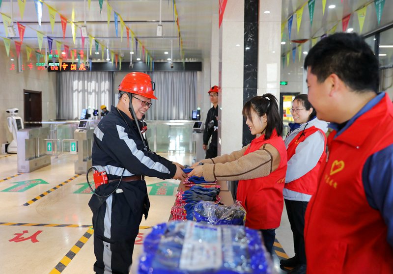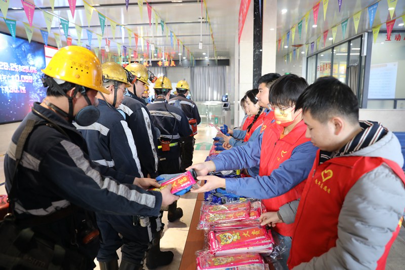 活動現場,青年志愿者們為一線職工送上繡有吉祥字樣的紅色鞋墊和勞保手套,祝福大家平安快樂、幸福如意,同時叮囑他們在井下作業一定要嚴格遵章守紀,按章操作,平平安安上班,高高興興回家。